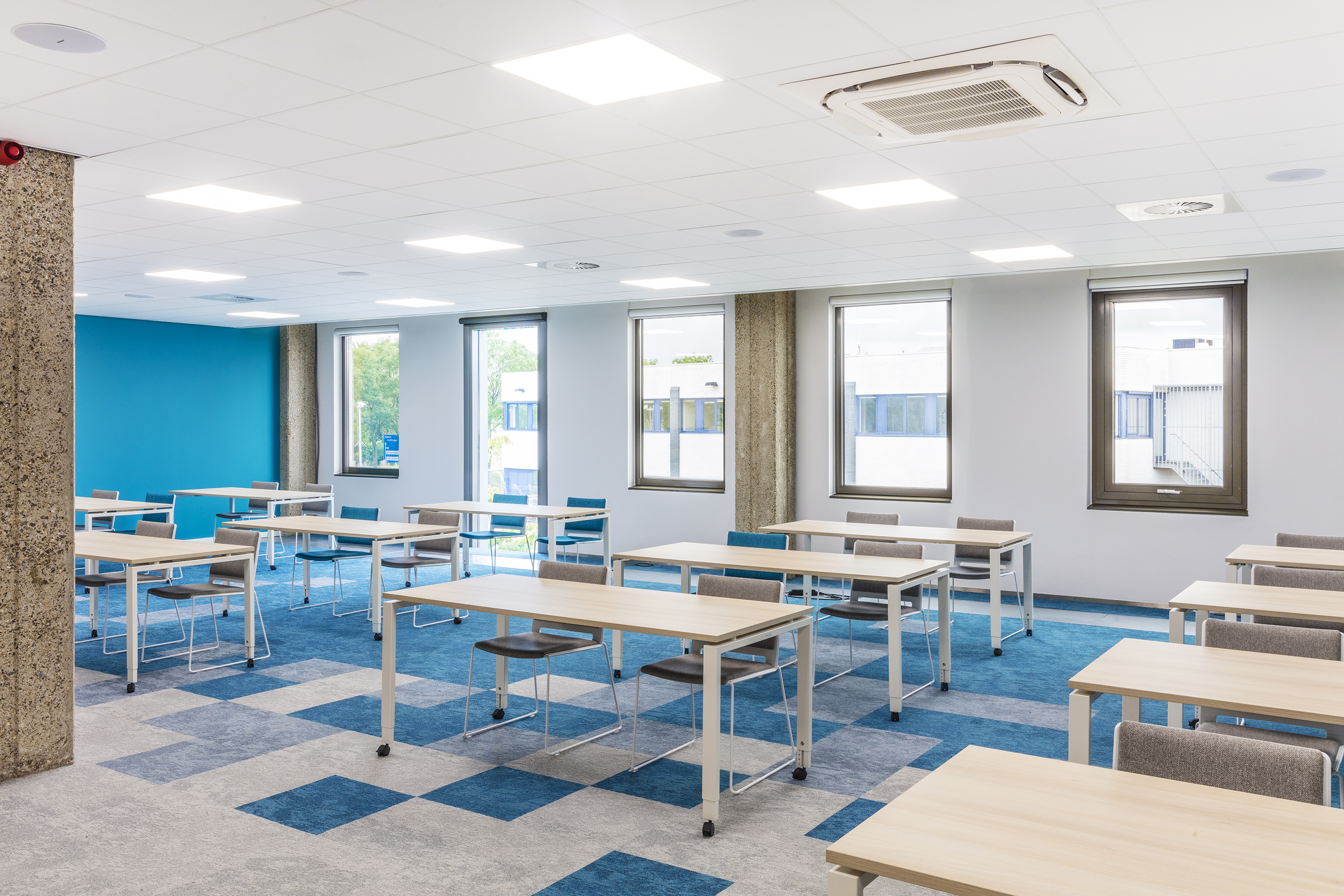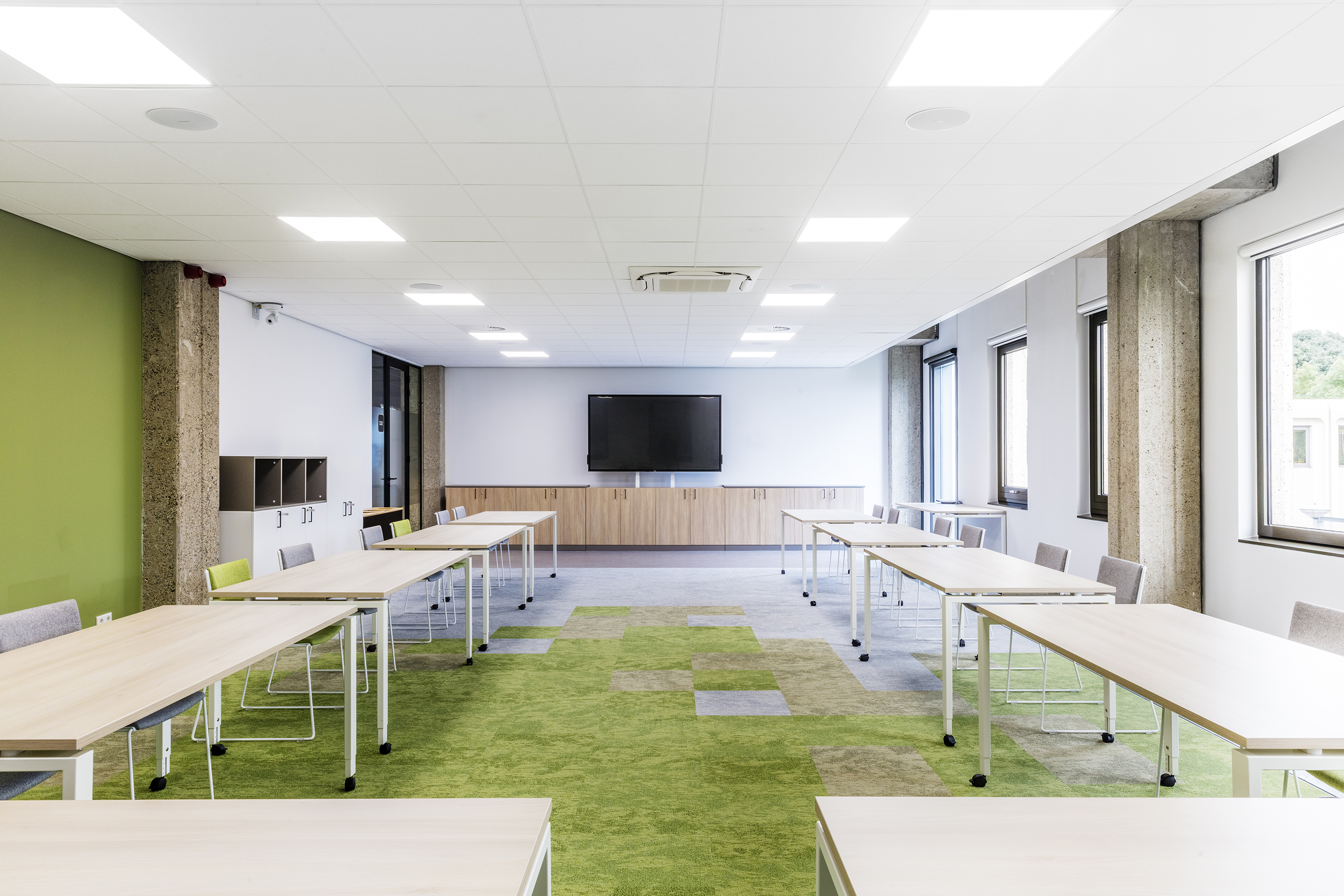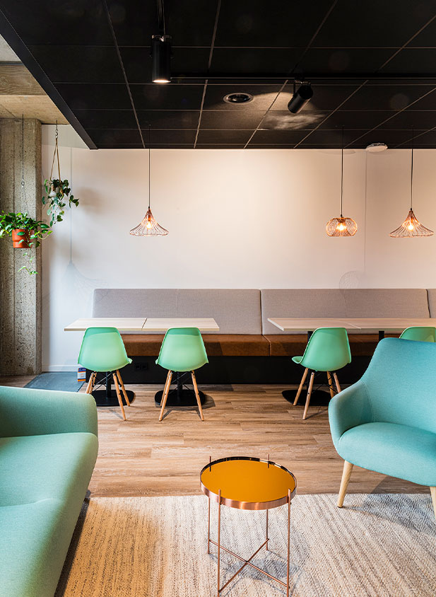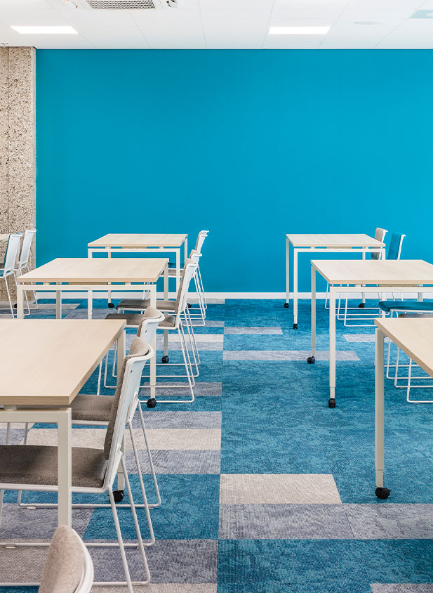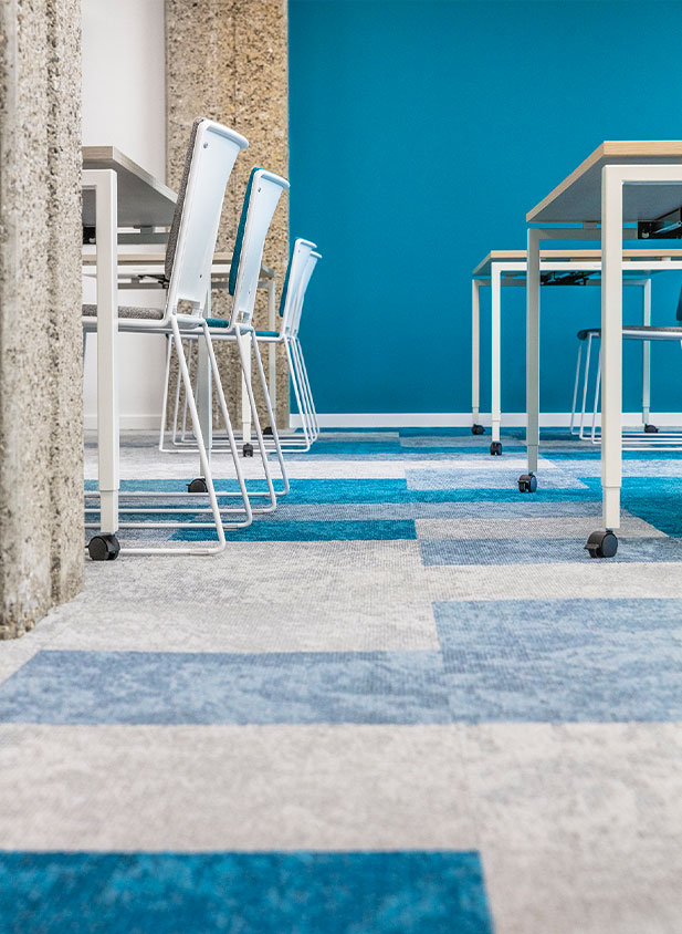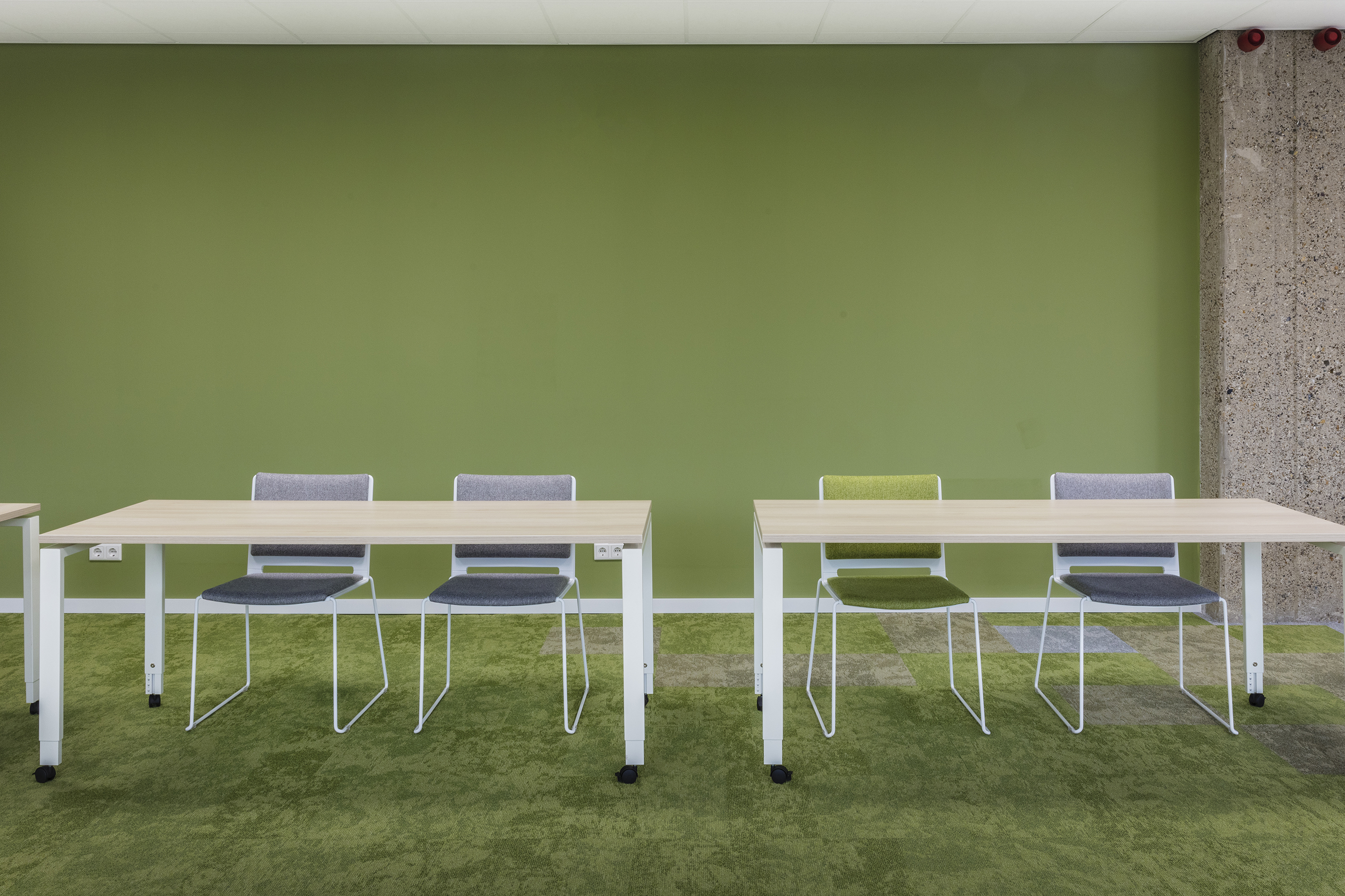 De indeling van de lokalen is flexibel, doordat het losse meubilair op wielen gemakkelijk verplaatsbaar is. Voor een speels effect matchen de stoelen bij de vloerafwerking, terwijl de houten elementen extra warmte en sfeer aan de ruimte toevoegen.