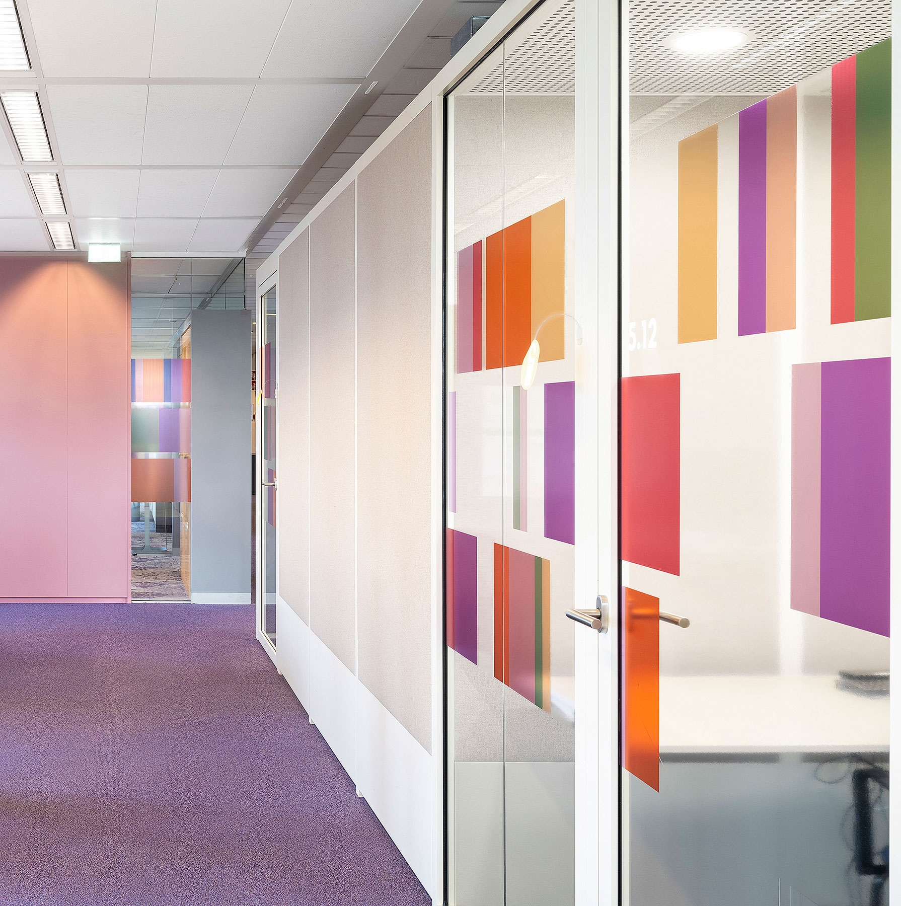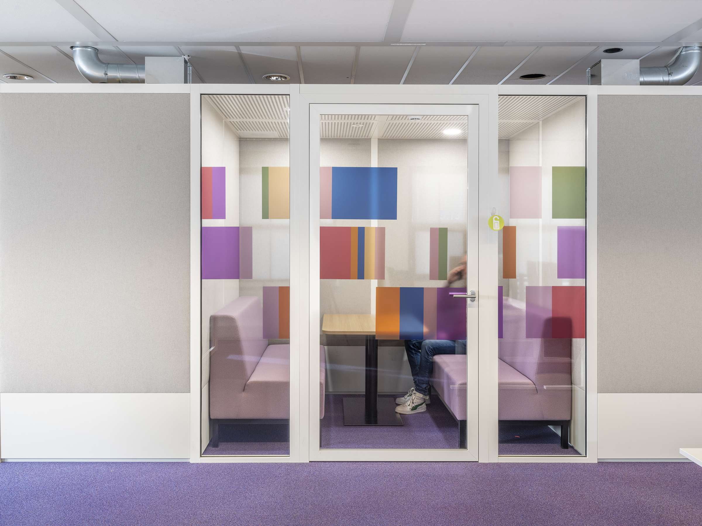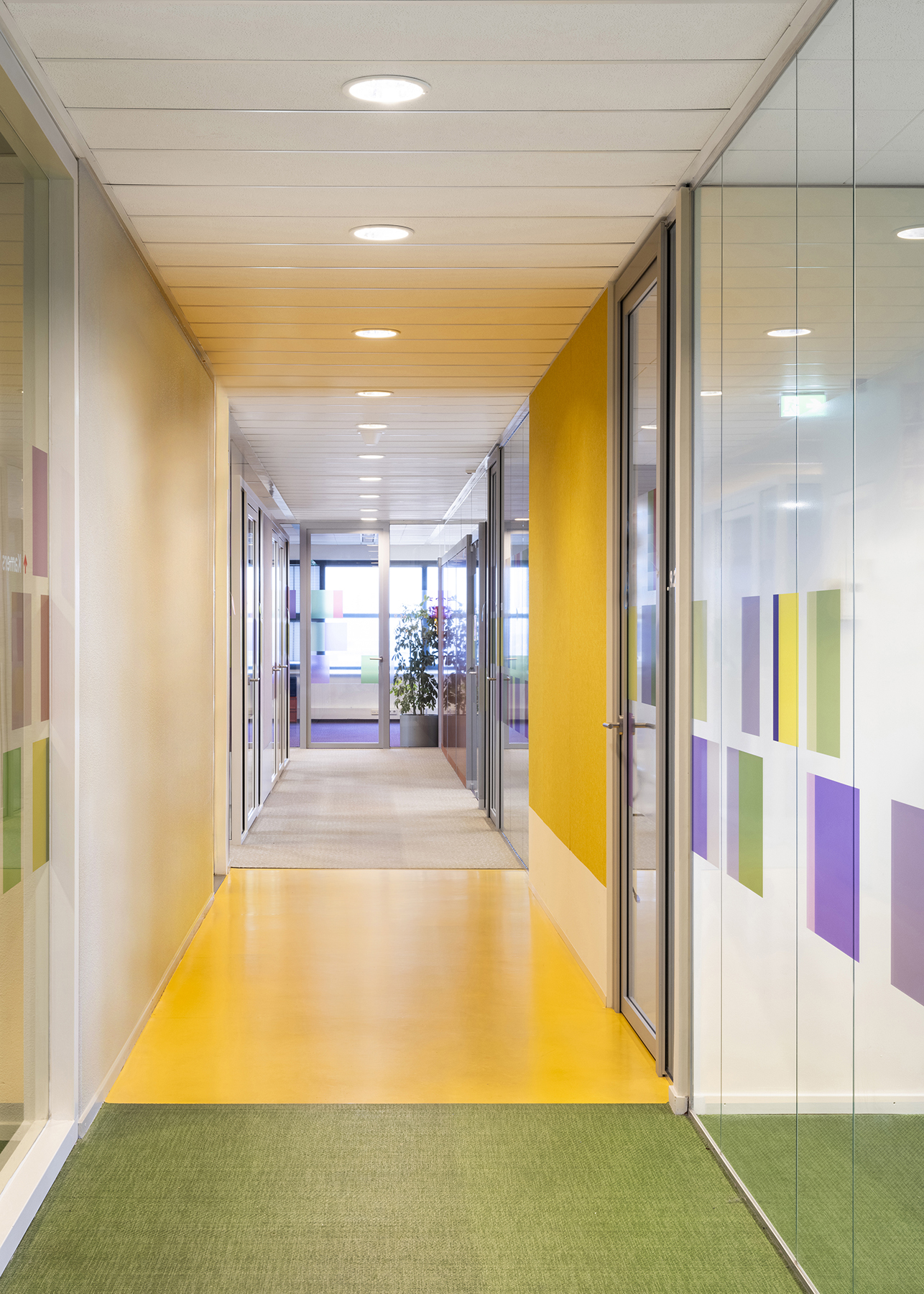 Voor de gemeente Amsterdam hebben we ruim 6000m² circulair ontworpen en het kantoor omgevormd tot een hybride werkomgeving. We zijn de uitdaging aangegaan om zoveel mogelijk bestaande interieuronderdelen te behouden en/of elders her te gebruiken. De felle, contrasterende kleuren van het oude interieur zijn verzacht door neutrale tinten toe te voegen.
