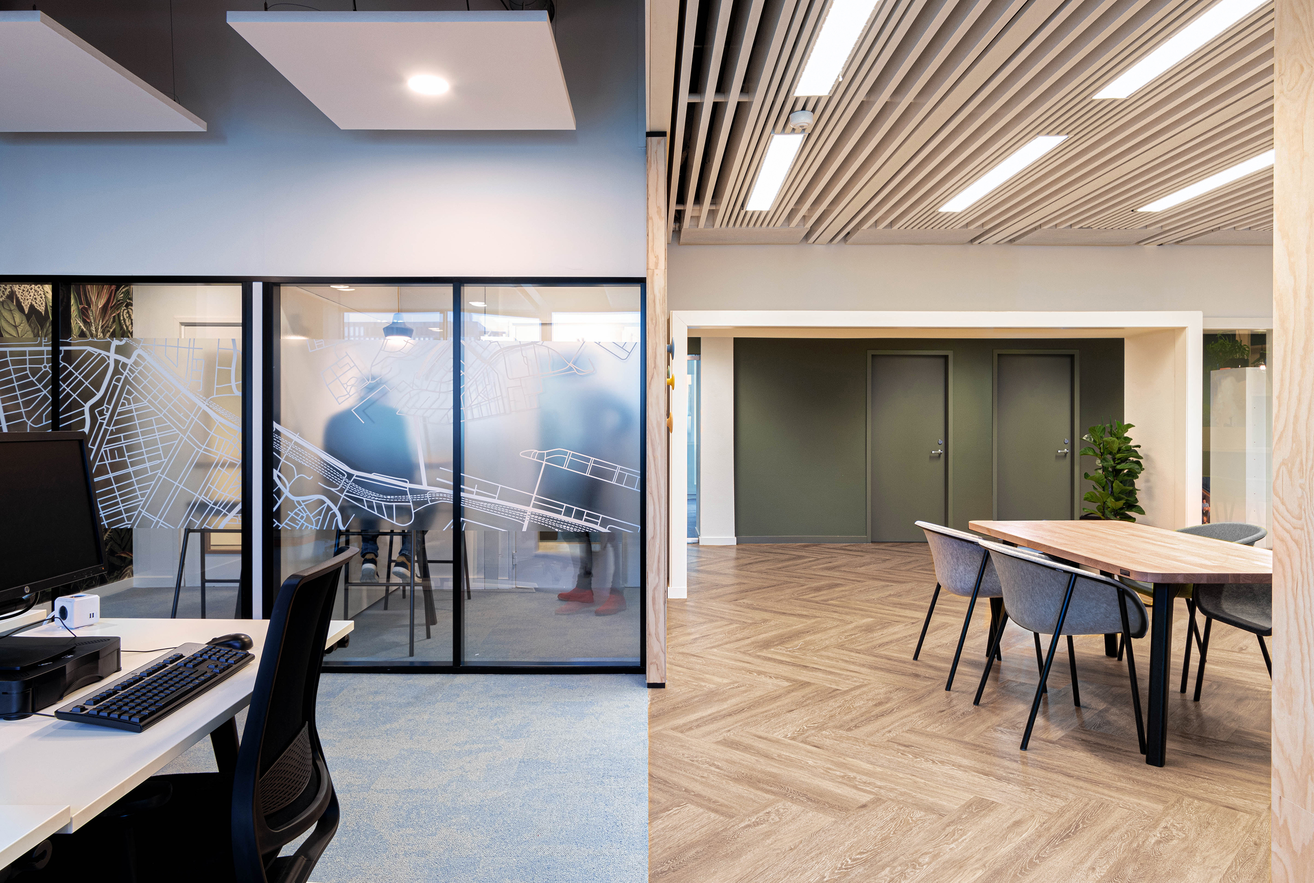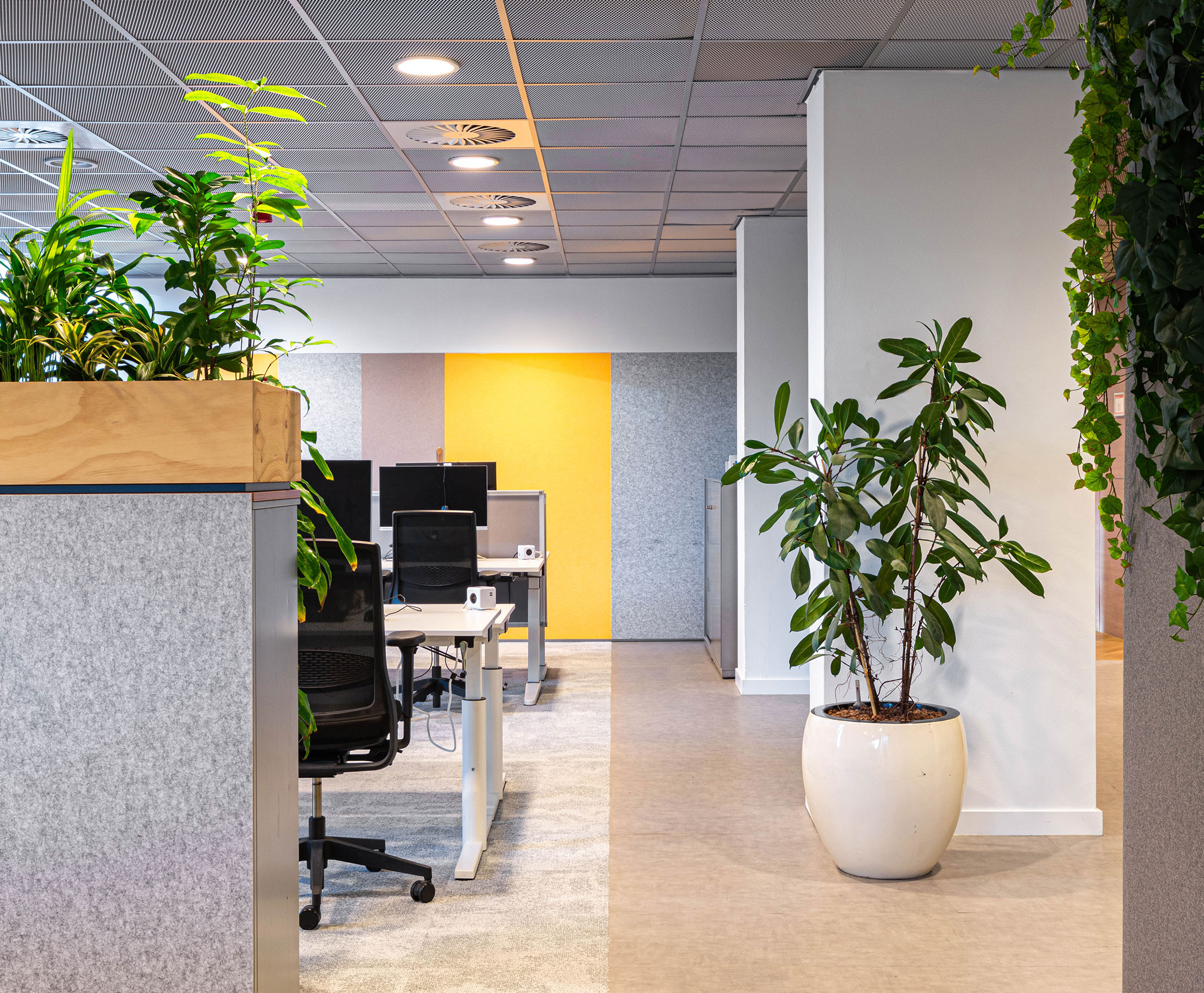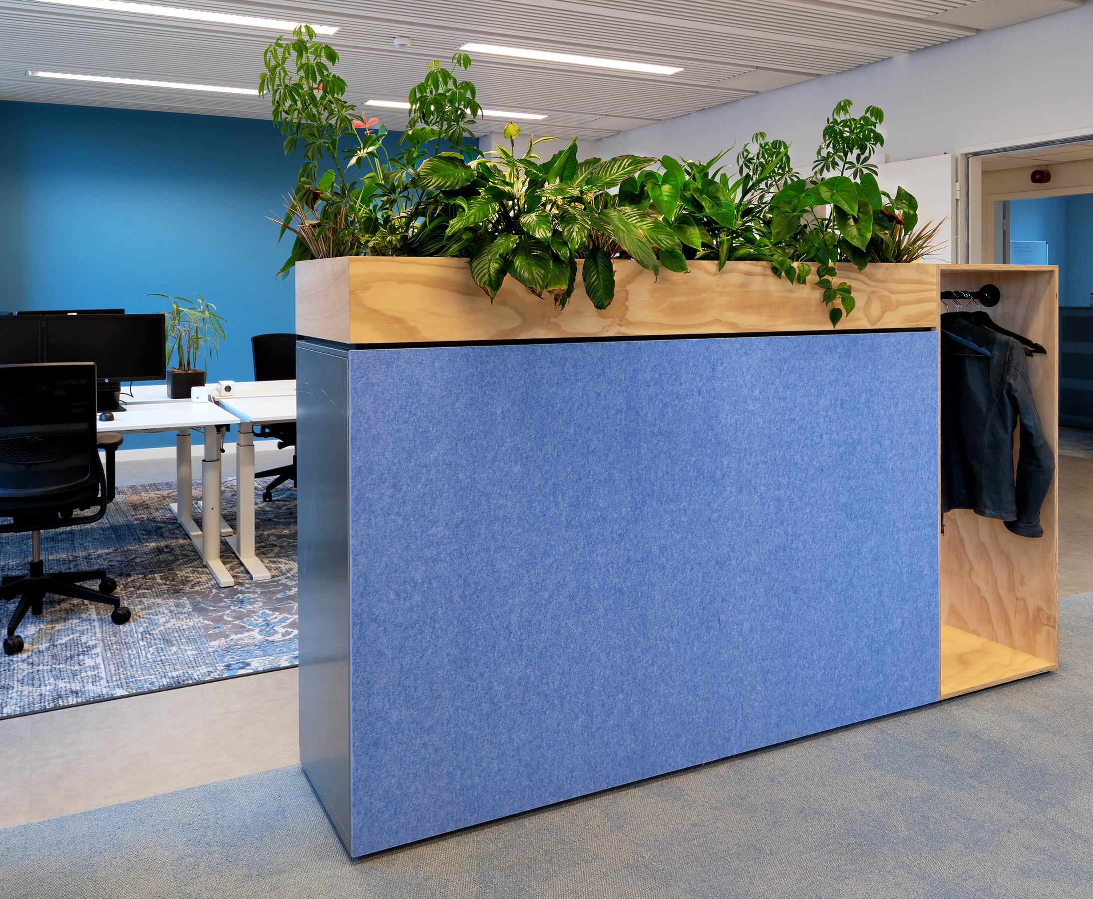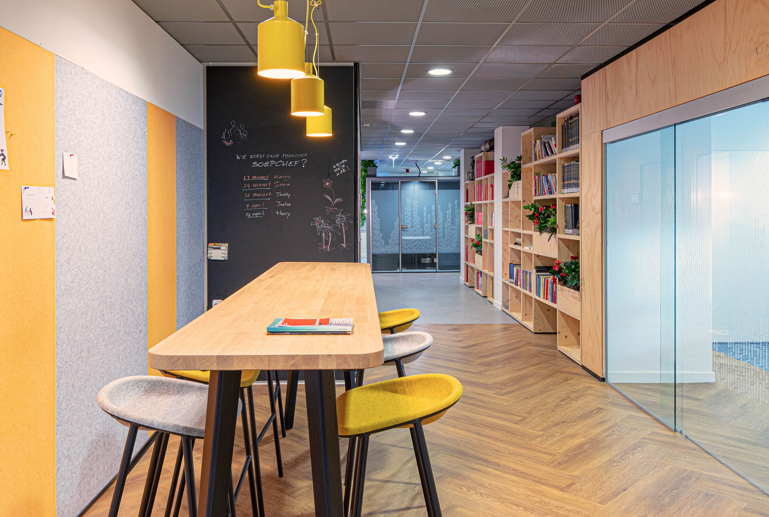 Veel interieuronderdelen zijn her ingezet, van glaswanden tot meubilair. Bestaande archiefkasten hebben een nieuw leven gekregen door sommige zichtzijden te voorzien van petfelt. Daarmee hebben ze, naast een nieuwe uitstraling, ook de functie van prikbord en werken ze tegelijkertijd akoestisch. Door ze aan te vullen met houten functionele kubusvormen, dienen ze als archiefruimte en als sfeervolle en multifunctionele dividers.