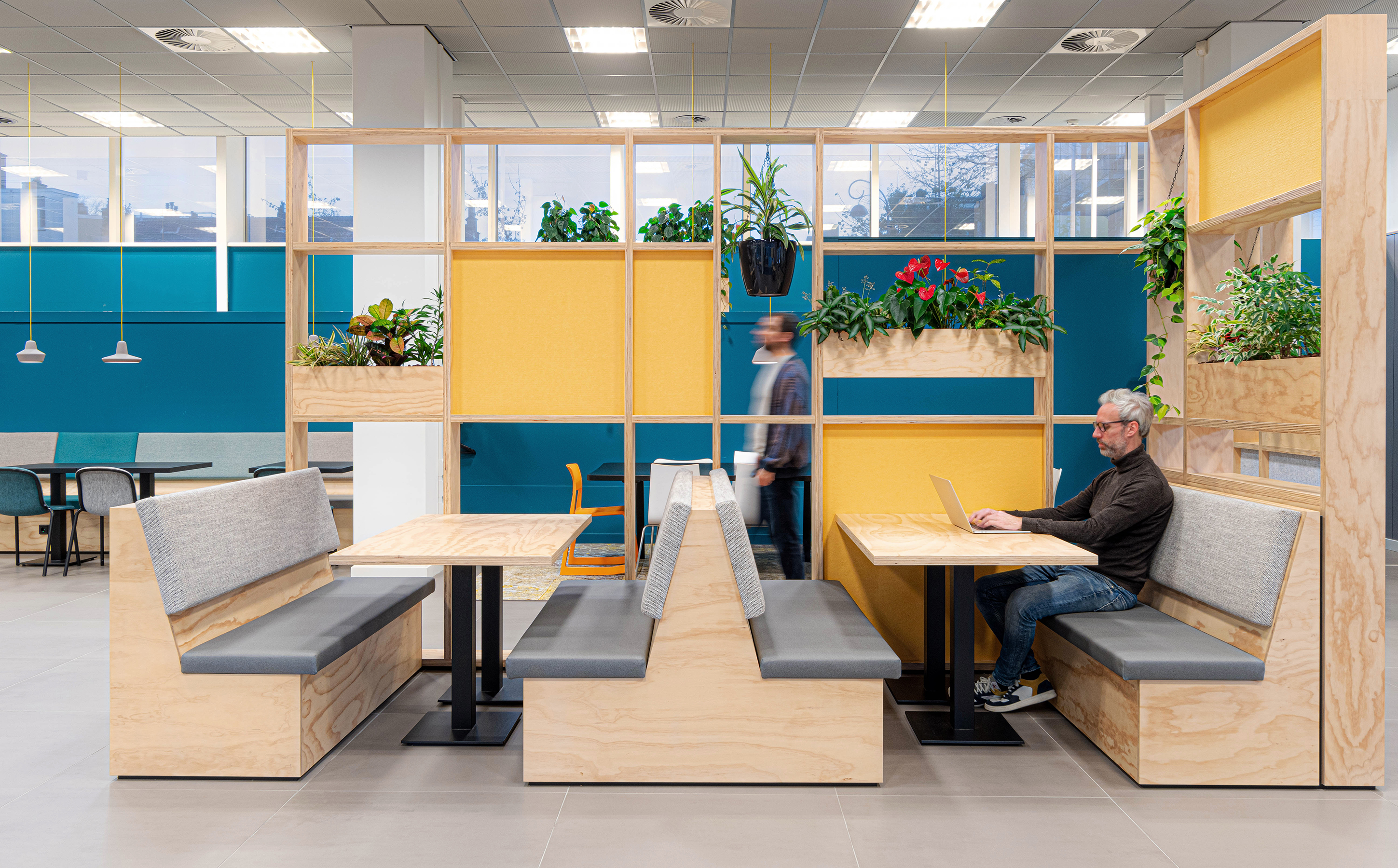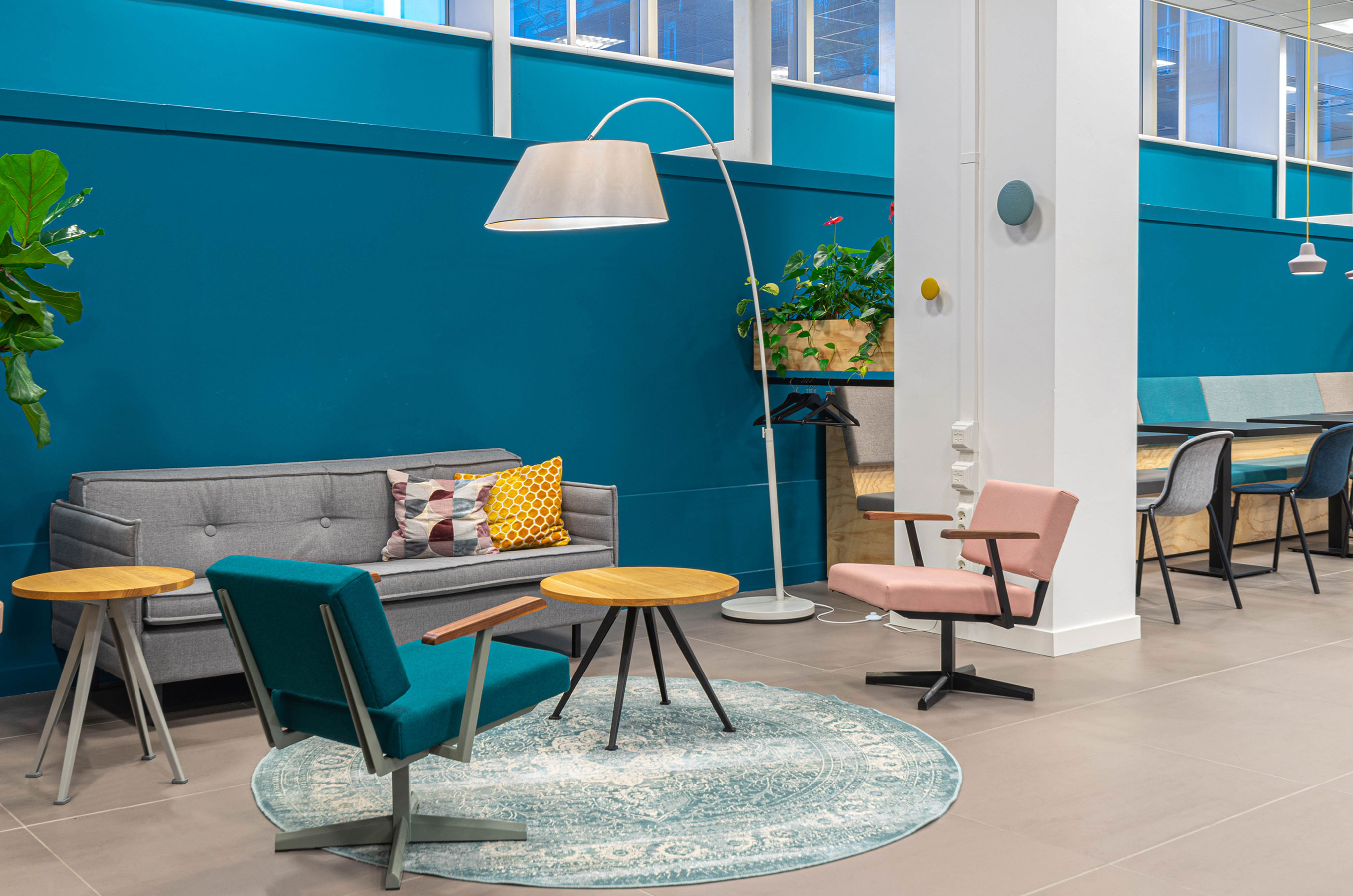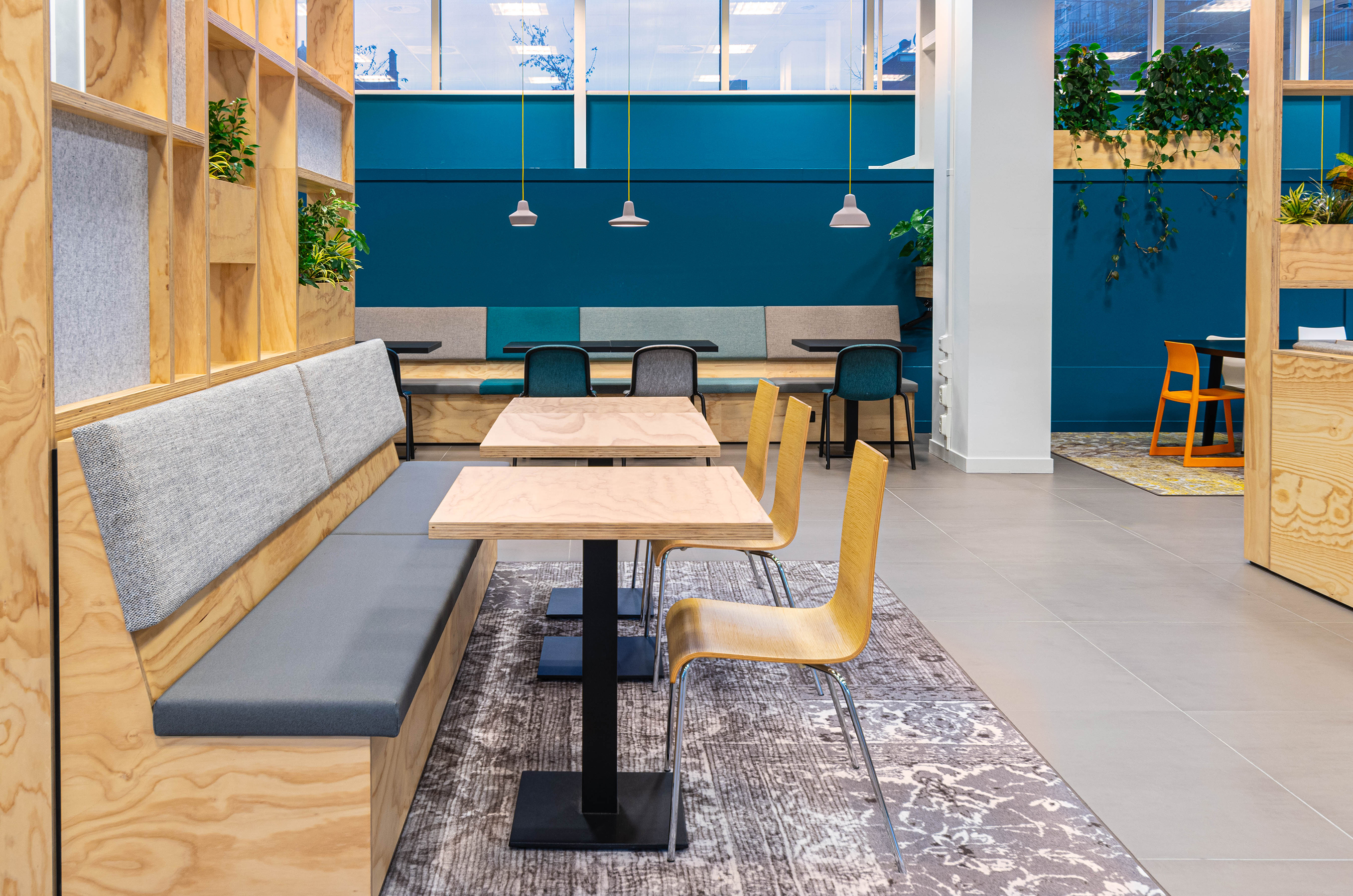 Op de begane grond is een multifunctionele ruimte gecreëerd om te lunchen, flexwerken, loungen en informeel te overleggen. De dividers zorgen voor verschillende functionele zones met intieme zithoeken in de grote open ruimte.