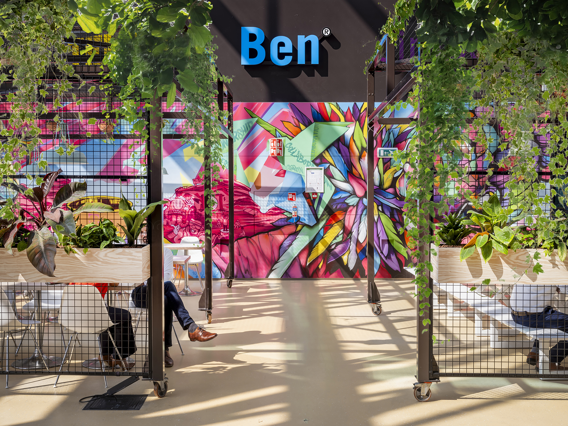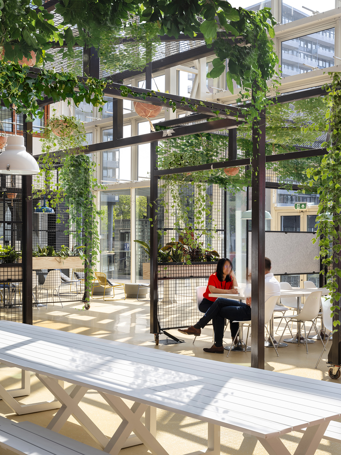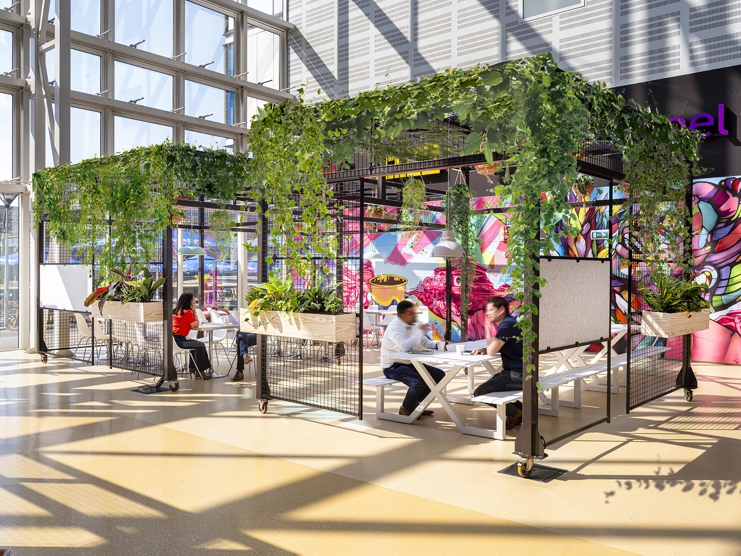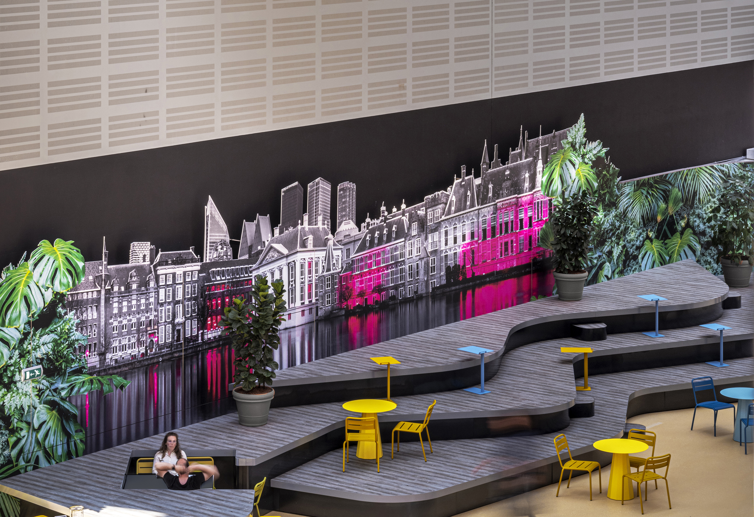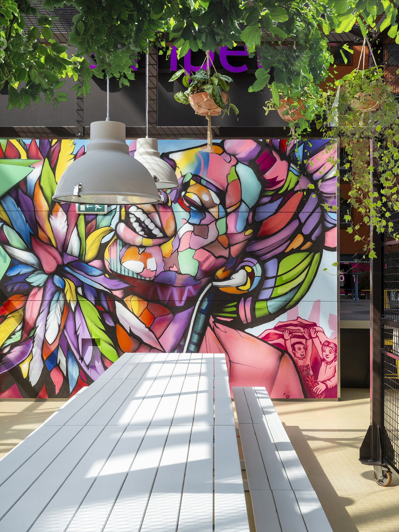 Door de grote glazen pui ontstaat er een prachtige verbinding met buiten. De interieurbeplanting, de picknicktafels en de graffiti wanden versterken het gevoel van een buitenomgeving, waardoor binnen en buiten met elkaar worden verweven.