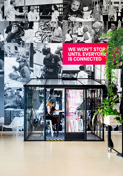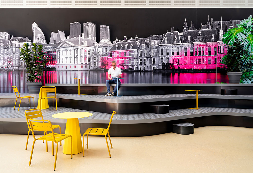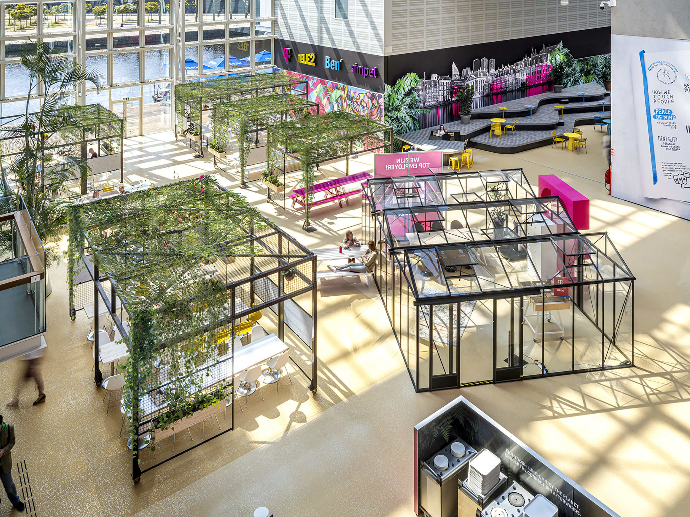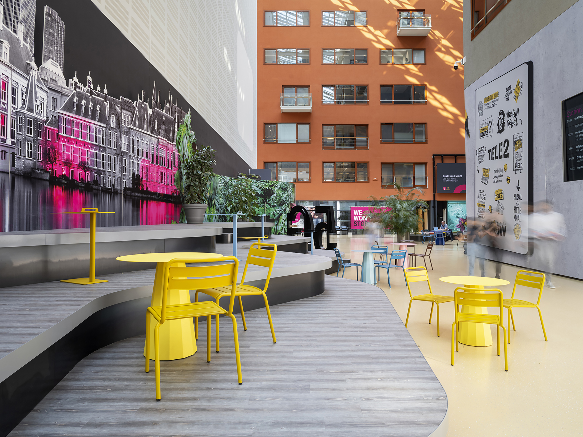 De beplanting in dit hoge atrium zorgt naast de gewenste ‘urban jungle’ sfeer, voor meer privacy en intimiteit. De petfelt panelen die de units deels afscheiden, zijn ook te gebruiken als prikbord en hebben een akoestische werking. Vanwege duurzaamheid is een gedeelte van het meubilair hergebruikt en zijn bestaande stalen ‘hokken-units’ her-ontworpen en aangepast. Deze sluiten zo mooi aan bij de gekozen functionele kassen die op meerdere plekken in het atrium zijn geplaatst. De ronde vormtaal van de ontworpen tribune en podia, zorgt voor een mooi dynamisch contrast met de binnenruimte. Hierdoor ontstaat een eigen identiteit in de grote open ruimtes. De gekozen kleuren van het losse meubilair sluiten aan bij de kleuren van de merken van T-Mobile-ODIDO